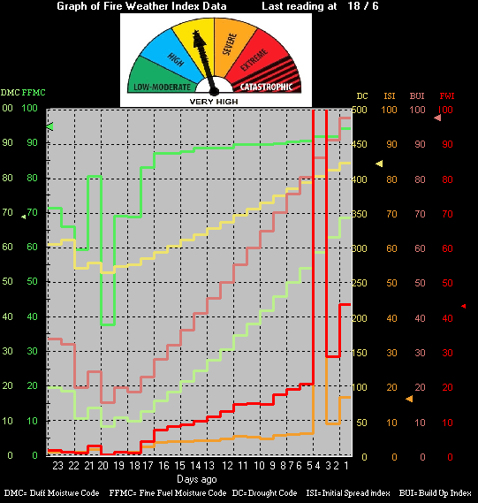 Last Updated: 18/06/12 at 1pm Current Weather conditions TEMP(°C) RH(%) WIND(Km/h) Direction 24 hour rain(mm) 32.2 22 13.9 352 0.0 Yesterdays values FFMC DMC DC ISI BUI FWI 92.2 63 413 9.1 91 28.4 Todays values FFMC DMC DC ISI BUI FWI 94.7 69 422 16.7 98 43.6![]()
